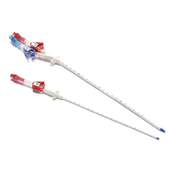 Catéter para hemodiálisis de corta duración, doble lúmen subclavia extensiones rectas, en poliuretano termosensible con recubrimiento hidrofílico. Con punta blanda azul (blue soft tip). Incluye set completo para inserción Seldinger, guía cuerda alta flexibilidad con punta J blanda en funda espiral con avanzador una sola mano, dilatador, aguja introductora, tapa de inyección, jeringa y bisturí. Marca SCW Medicath. Origen China. Medidas: 12Fx15cm 12Fx20cm – 12Fx30cm