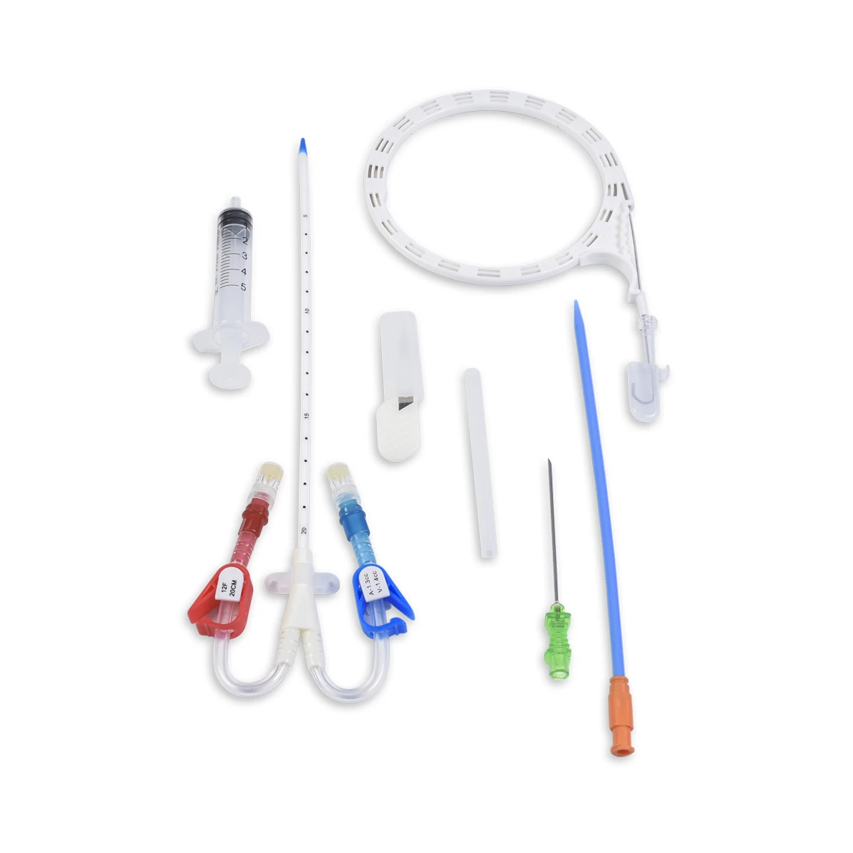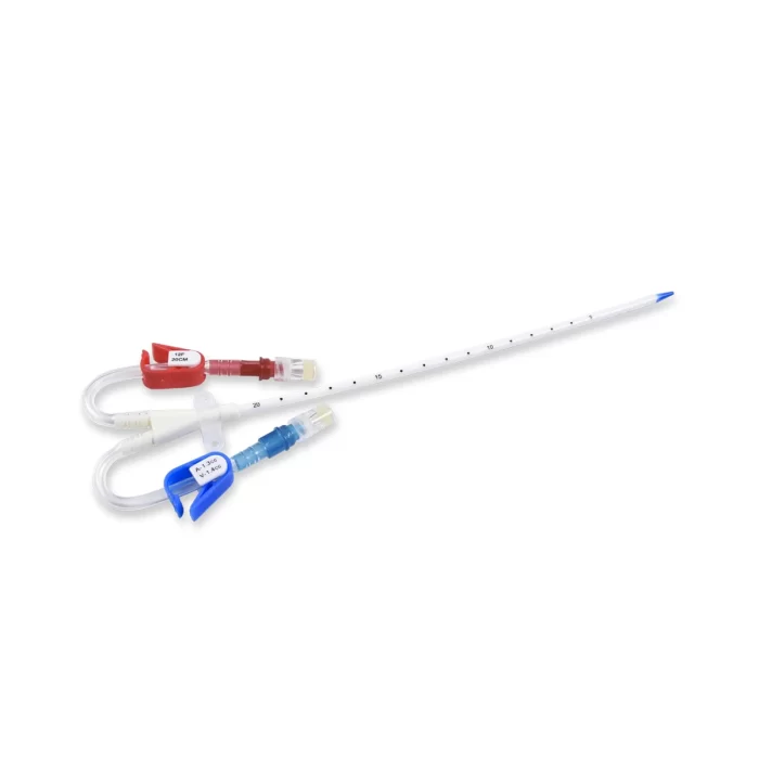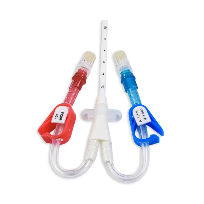 Catéter para hemodiálisis de corta duración, doble lúmen yugular extensiones curvas, en poliuretano termosensible con recubrimiento hidrofílico. Con punta blanda azul (blue soft tip). Incluye set completo para inserción Seldinger, guía cuerda alta flexibilidad con punta J blanda en funda espiral con avanzador una sola mano, dilatador, aguja introductora, tapa de inyección, jeringa y bisturí. Marca SCW Medicath. Origen China. Medidas: 12Fx15cm 12Fx20cm – 12Fx30cm