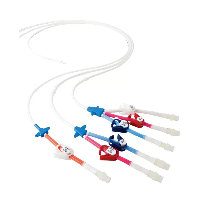 Catéter venoso central de larga duración Bio-Cath, de doble lumen tipo Hickman con manguito (cuff) de poliéster, con set completo para introducción, incluyendo aguja introductora, guía de alambre, introductor Peel Away, tunelizador de acero inoxidable y bulbo Raulerson. Marca Medcomp. Modelo Bio-Cath. Origen USA. Estéril. Medidas: 9,5Fx90cm 2L- 7Fx90cm 1L – 6Fx90cm 1L